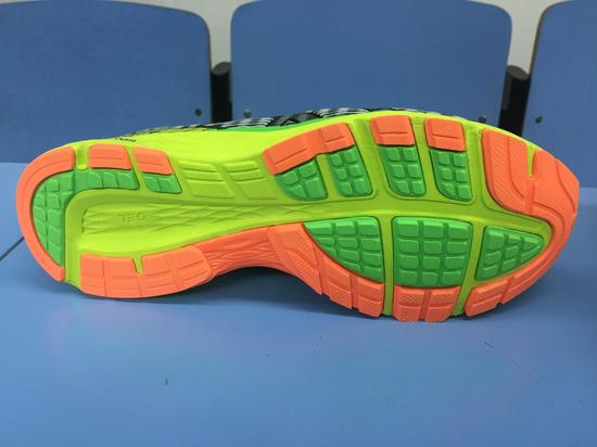 耐磨方面,鞋底的两个颜色的橡胶表现不一,绿色橡胶较柔软,耐磨并不出色,在使用了20KM后,上边的花纹已经很浅。橙色橡胶相对好很多,也更硬,测试完成后并没有磨损太多。