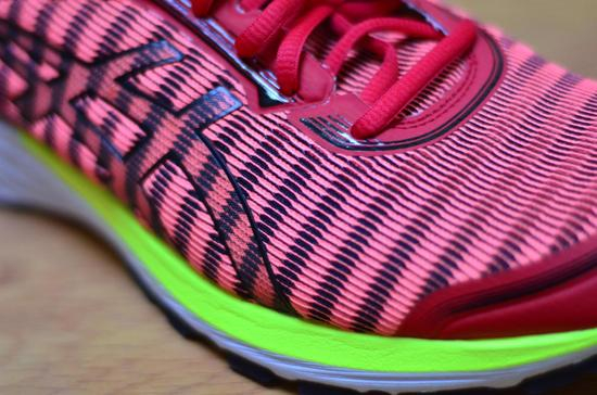 DynaFlyte跑鞋在外观的设计上有了很大的突破,不同于以往亚瑟士经典的肌肉型设计,DynaFlyte看上去更显时尚。我拿到是一款红黄黑搭配的跑鞋,跑鞋整体看上去呈现流线型,鞋子更加注重细节部分的处理,包括鞋身上各处的文字和logo,看上去都很美观不显突兀。