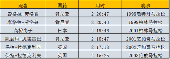 马拉松个人历时最好成绩:男子(国际田联认证纪录赛道)