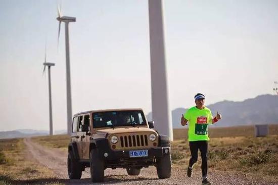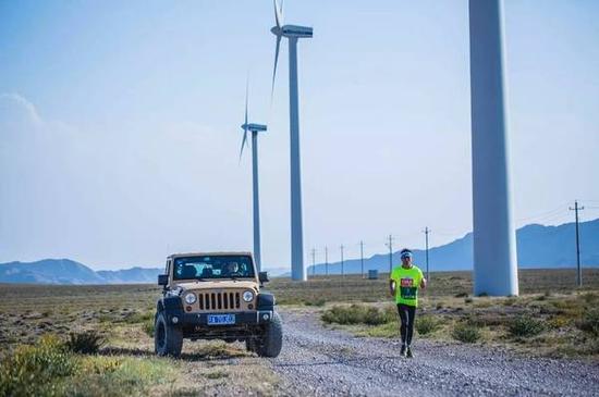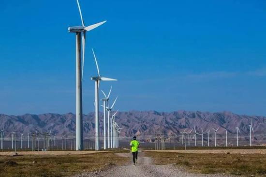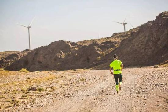 亚洲最大的风电场横亘在赛道上,夕阳西下,奔跑在旷野中体味那种天下唯我的孤独苍凉感。