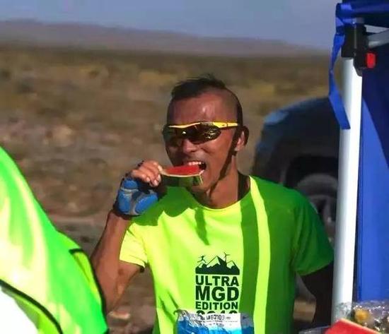 太阳升到头顶,温度也越来越高,酷热的环境考验着跑者们的体力与耐力。让我们吃惊的是,率先经过前几站的竟是一位60岁的长者,他所报的项目是100公里个人赛组,真让年轻人都望尘莫及。