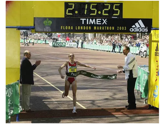 然后到了2003年4月13日伦敦马拉松,拉德克里夫在家门口跑出2小时15分25秒的好成绩,创世界纪录,牢牢保持至今!(来源:田径大本营)