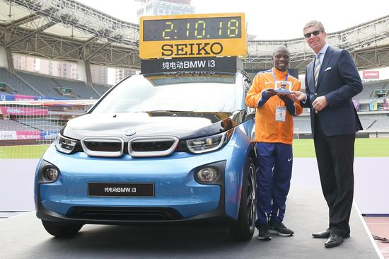 2016年10月30日,国内顶级马拉松赛事之一—上海国际马拉松赛在黄浦江畔的金牛广场鸣枪开跑。在38,000多名来自世界各地的参赛选手中, 南非选手Stephen Mokoka以2:10:18的枪声成绩获得本届比赛的男子组冠军,埃塞俄比亚选手Bekele Roza Dereje以2:26:18的枪声成绩获得女子组冠军。作为上海国际马拉松连续四年的荣耀赞助商,今年,宝马以最新款纯电动车BMW i3升级版作为比赛计时引导车,同时还首次携新能源车家族亮相赛道,并邀请奥运冠军王镇和刘虹加入宝马跑团。宝马与广大跑者在激情奔跑中共同倡导积极健康的生活方式,并以创新的体育营销战略成为都市绿色出行的引领者。