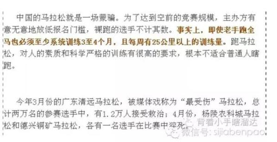 上个月开始,微信圈里就开始转一篇文章,叫做《马拉松,当今中国最无耻的体育骗局》。一开始我还真没留心,以为就是个标题党,后来点进去一看,哇擦,还真是题文一致啊。