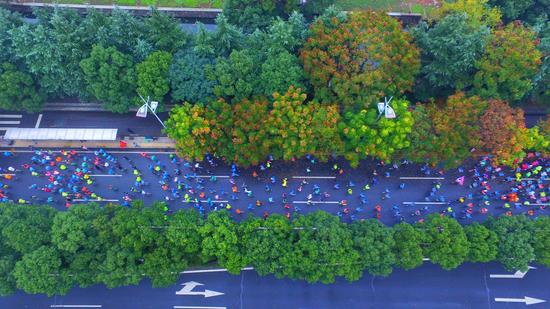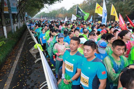 比赛开跑前,志愿者站成人墙手举各类温馨提示牌,提示选手们在比赛过程中的注意事项,主持人还代表组委会对11月20日过生日的选手送上了生日祝福,让现场的所有人共同祝福在比赛当天过生日的这43名选手。