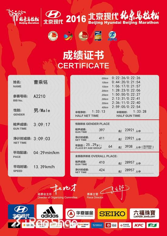 乘铭把PB留在了北马,赛前他咨询了杨教,杨教和他说,不要求你太辛苦,310-315吧。“我听出言外之意难道是辛苦一点可进310?于是赛前我定了两个计划,一个跟310兔,进310,一个保证320内。记得杨教当时已远赴美国,但在比赛前一天特意给我微信加油,瞬间感觉内心充满力量!最后按照计划超额完成任务3:09:17,我很满意。”