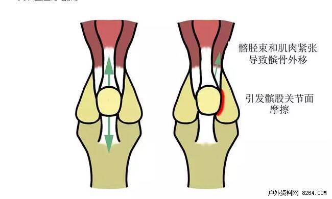 那么,为什么髌骨在运动时会发生运动轨迹异常呢?通常情况下,大腿外侧肌肉比大腿内侧肌肉发达,另外髌骨外侧的腱性结构,如支持带、髂胫束更容易发生紧张,这些因素都使得髌骨容易被拉向外侧,从而导致髌骨不是平顺地在凹槽里滑动,并使得髌骨外侧异常负荷或者髌股关节面压力增加。