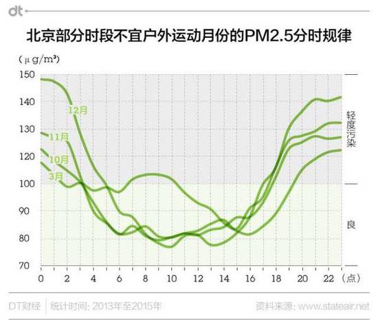 众所周知,冬天是京霾最“浓醇”和频繁的季节。每年10月、11月和12月期间,北京的PM2.5浓度会从下午4点中开始到午夜一直呈现上升趋势,夜间的PM2.5浓度往往最高,不宜外出跑步。但白天要比夜间浓度低,清晨6点至下午4点间,会出现一天当中空气质量最好的情况。因此,喜欢夜跑的小伙伴,在这几个月份里,最好能习惯晨跑。