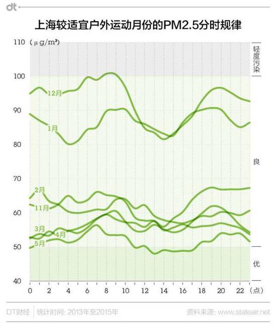 广州各个月的PM2.5平均值都在90以下,这一点和上海有点类似,从其分布规律来看, 10月至次年4月,下午是比较适合户外运动的时间 ,而且广州人民还可以享受到一个温暖的冬天。