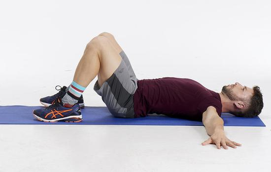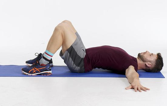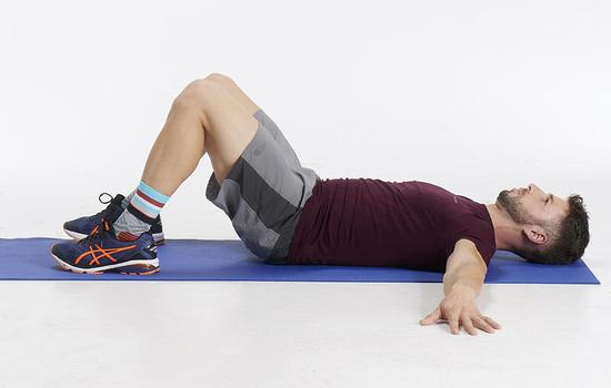 将背部平躺在地上,脚在地板上放平。用鼻子吸气。注意腹部隆起以及尾骨推向地面的感觉。
