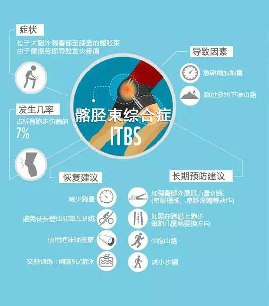 髂胫束综合症髂胫束位于大腿外侧,从臀部延伸到膝盖。在跑步时,你膝关节弯曲、伸展,将使髂胫束和大腿骨摩擦。若增加里程太快,特别是下坡跑时,就可能拉伤。