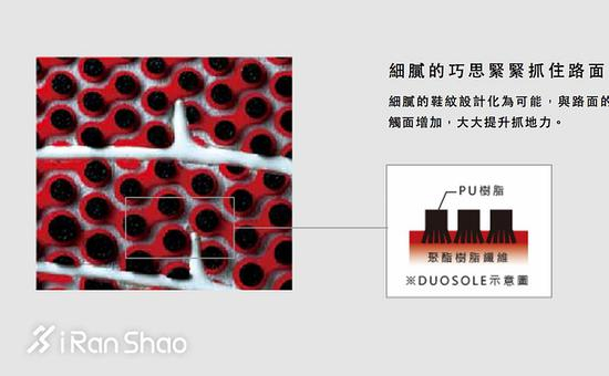 相较于过去一体成型的橡胶大底,全新的DUOSOLE采用的是基布黏着鞋纹的方法,所以在设计上自由度更高,鞋底的树脂分布和齿纹设计有了更多的想法。这一年搭载了DUOSOLE大底的TARTHER EX-01跑鞋也正式上市。