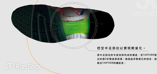而这样的设计也得益于1989年ASICS推出的TARTHER RX-a,首次将全掌的中底进行了分割,实现了前掌与后掌不同的设计。如此的设计让后来的TRUSSTIC有了被置于足弓的可能性。
