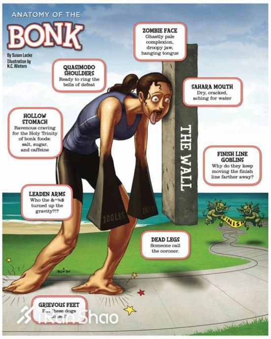 目前网上有两类说法,一类认为光靠糖原最多只能支撑90分钟左右的耐力运动,一类认为糖原的消耗还是应该按照距离来算,也就是30公里往后,正好是专业/非专业选手都最容易遇到“撞墙”危机的距离。