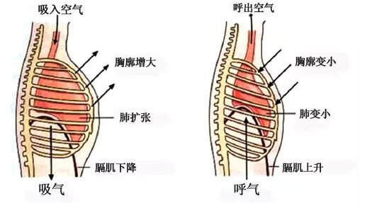 简单说,吸气和呼气是依靠膈肌和肋间肌等的活动而产生的。在膈肌收缩、横膈变得扁平的同时,肋间外肌收缩,肋间内肌舒张,肋骨向上、向外移升。此时胸腔体积增大,内压力减少,人就吸气。反之,当膈肌和肋间外肌舒张,肋间内肌收缩时,人就呼气。
