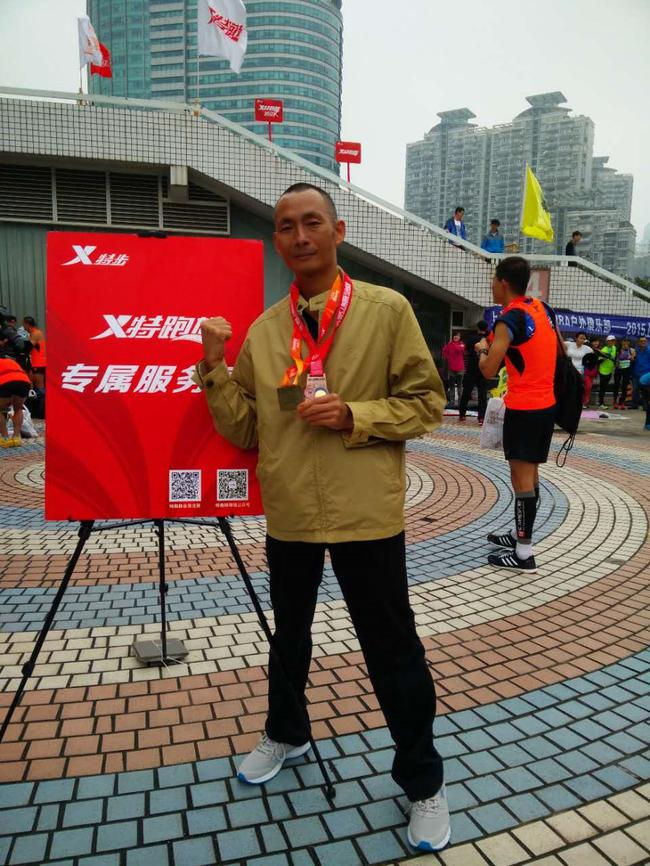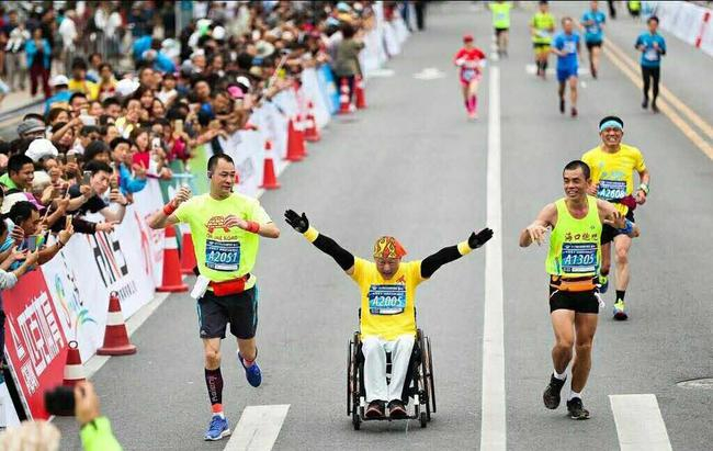 我和儿子在十五年前的一场意外中受伤,造成我脊髓损伤后截瘫,肚脐以下失去知觉,从此轮椅为伴。失去了喜欢的工作,生活发生了翻天覆地的变化,好像被整个世界抛弃了一样,一度沉浸在失落沮丧的情绪当中。幸运的是,有爱人的精心照顾,在家庭的力量支撑下走出了阴霾。在经历了情绪的低谷和生活的迷茫后,我想到通过运动去做一些改变,尝试着划轮椅锻炼,发现运动锻炼改变了我的身体状况,心态也变的乐观向上。得知马拉松在国内盛行,去年5月底尝试参加了第一个比赛,烟台福山马拉松十公里轮椅组,取得了52‘18“的成绩并拿了第二名,从此与马拉松结下了不解之缘,至今已参加过厦马、广马等大小15场赛事,其中8个全程,5个半程,2个十公里,全程最好成绩广马353,半程147。