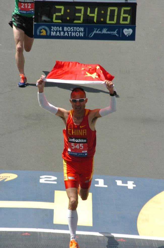 2014年4月21日,参加世界六大马拉松之美国波士顿马拉松,在36000名选手中以2小时34分03秒身披五星红旗冲过终点,位列133名,成为该赛事举办118年来跑得最快的中国人、华人。