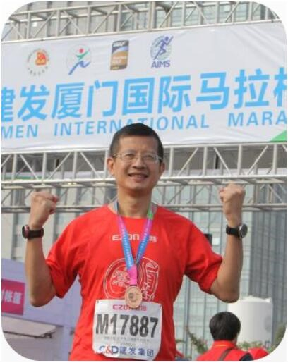2008年开启跑马之路。经过一年的精心准备在2009厦门马拉松,以3小时59 分完赛。在止后的8年间已经成功完成了北京马拉松、马来西亚槟城马拉松、香港马拉松、金门马拉松等国内外41个全程马拉松赛( 全部都在4小时以内完赛),最好成绩是2012上海马拉松2小时59分。2015厦门马拉松310官兔,2015福州马拉松330官兔,2016武汉 马拉松330官兔。
