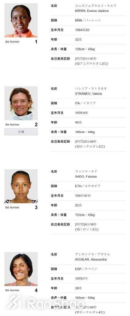 今年的头牌精英,是2014仁川亚运会冠军兼2016里约奥运会亚军、肯尼亚出生的巴林选手基尔瓦(Eunice Kirwa)。32岁的她于2015年创下名马赛道纪录2:22:08,PB为2:21:41。