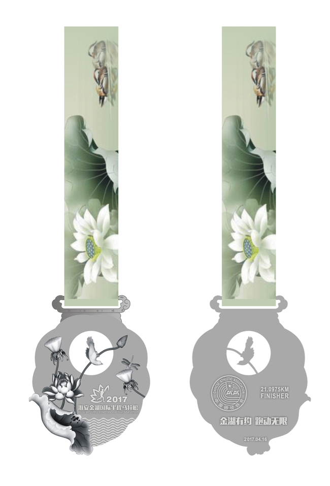 根据组委会公布的奖牌样式显示,本次半程马拉松完赛奖牌的主题是围绕荷花进行设计,作为苏北县城,金湖有“荷藕之乡”美称,在2009年举办的“荷乡金湖-中国荷文化高层论坛”上,金湖县被中国民间艺术家协会正式命名为“中国荷文化之乡”和“中国荷文化传承基地”,因此本次半程马拉松的完赛奖牌正面左下方有一朵荷花,中间镂空的部分有一只小鸟,旁边一只蜻蜓停在一朵荷花上,象征着金湖生机勃勃,物产丰富,在奖牌正面下方,是带有3D造型的湖水,从视觉上看给人以动感,奖牌的背面印有中国田协的logo和本次金湖国际半程马拉松的口号“金湖有约,跑动无限”。