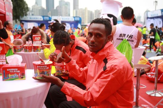被香味吸引而来的还有国外运动员,这其中就包括了几名本届重马的国际专业选手,他们在赛后尿检完毕后,催促着翻译带他们来吃面。据了解他们是从自己的非洲同胞运动员口中得知赛后吃面可以补充能量恢复体能,享受了一碗东方美食后,几人又恢复了赛前的活力,兴致勃勃的在现场合影留念。