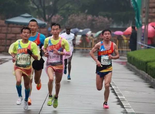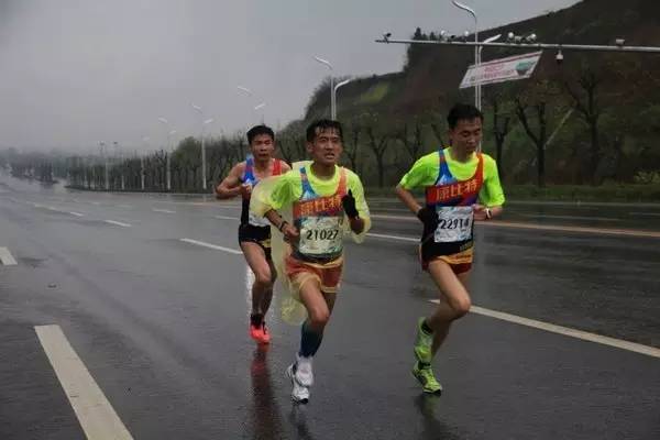 收拾停当后,他和队友换好比赛衣服,外面套上主办方提供的一次性雨衣,7点半从酒店慢跑前往起点,占据前排有利位置。