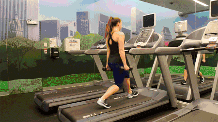 拿一套5-10磅的哑铃,防止在跑步机显示屏的旁边。设置一个舒适的带速--建议速度设在不超过你平时步速一半的数值,开始的时候慢慢地走。每只手各持一个哑铃,向前迈出一大步,右脚放低成弓步,让膝盖和第二个脚趾保持同一直线。当你恢复到庲的位置,马上将你的左脚向前跨一大步,放低成弓步。每一边重复完成10-15次。如果你担心不能提起哑铃,可以尝试做一个简单的修改,把双手叉腰上。