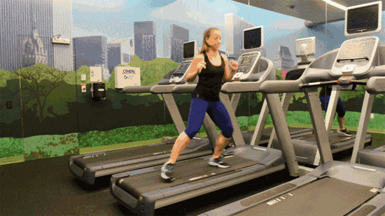 可以将你的跑步机速度调整为稍微比你平日步行速度快一点,从走路切换到跑跳。当你找准步伐,把腿提到一个固定的位置:将你的右脚膝盖朝胸部抬起,同时放下左脚,尽可能纵身往上跳,躯体绷直。接着迅速把右脚放下,左脚往胸部抬起。重复交替进行30秒。如果你还没准备好在跑步机上做高抬腿,那就先做好跳跃的动作。
