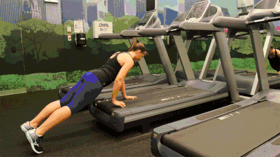 这个动作是用手而非脚来完成。将跑步机的速度设在0.5-1英里/小时。走到跑步机的尾部,做一个平板支撑的姿势,双脚踮在地板上,双手与肩同宽撑在跑步机上的固定侧。当你准备好以后,将双手放在跑带上。当跑带启动,手随着带子的输送来到你的面前。随着跑带的带动,继续交替双手完成动作,每边做10-15次。请确保你在做这个动作时臀部提起,避免任何扭转动作移开了你的双手。