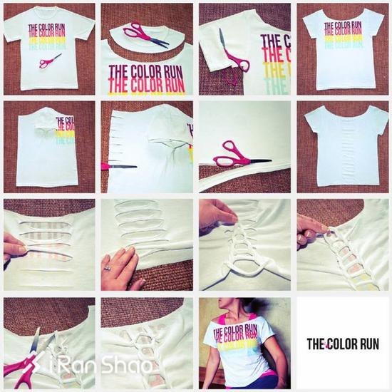 基本上所有的赞助T恤都是沉闷的圆领,小心机们不妨试试改造成V领,或者挖大挖深领口,能拉长脖子的曲线,恰当好处地显瘦。