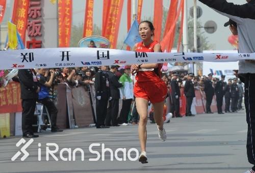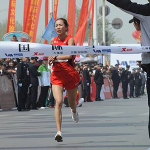 5月28日在营口鲅鱼圈国际马拉松,她以1:15:53夺得半程组亚军,仅次于一名非洲选手。(下图为何引丽夺得2015年横店半马冠军)