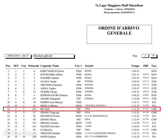 何引丽的半马PB也是在同一个月创造:在意大利Stresa举行的马乔罗湖半马,她以1:11:34夺得女子亚军。