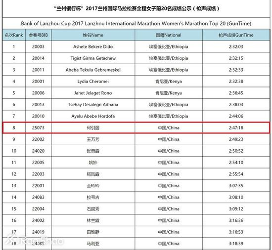 最后何引丽以2:47:18完赛(平均配速3:57),名次是国际第八,国内第一。