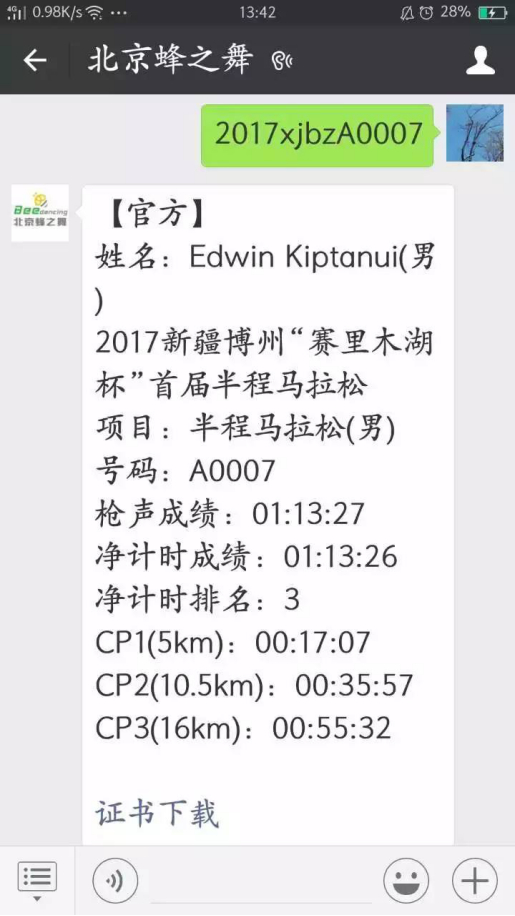 进入公众平台,在对话框输入“2017xjbz+参赛号”,如下图: