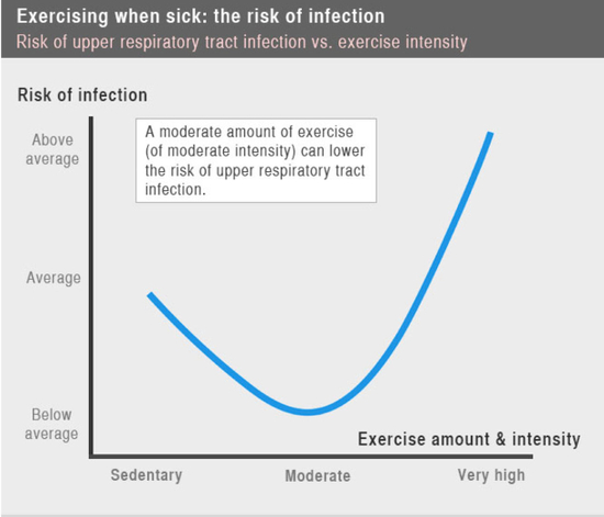 但我们躺在沙发上只看电视啥都不做时,我们的免疫系统是图中纵轴上“受感染风险”中间的“平均水平”左右。随着运动量从轻微到适度的增加,免疫系统健康也会得到改善(如图即受感染风险在下降)。然而,随着运动量超过适度水平并持续超量后,受感染风险也会迅速增加!在这种负荷下,我们的免疫系统会受到严重损害。