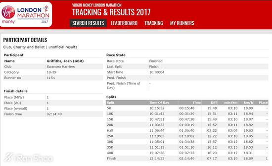 格里菲斯因此赢得参加伦敦世锦赛的资格,将与去年伦马国内冠军、里约奥运会第九的苏格兰帅哥霍金斯(Callum Hawkins,2:10:52),以及前面说的戴维斯一道,联袂为国出征。