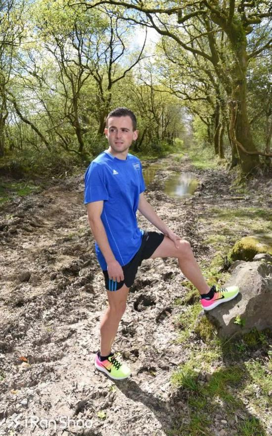 这位威尔士斯旺西猎兔犬(Swansea Harrier)田径俱乐部的年轻成员,拿的是俱乐部名额,出发位置位于特邀选手区后面10米。