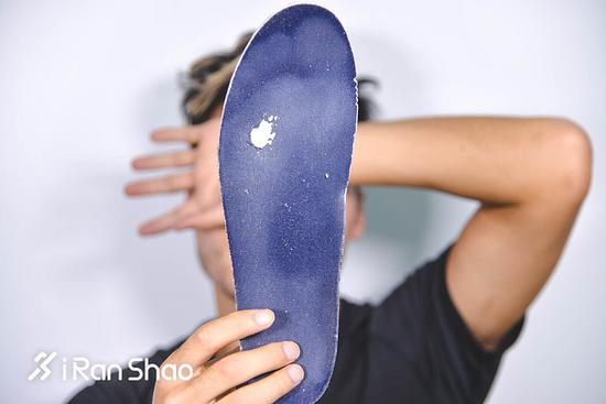 其实这双鞋一点也不像跑了2000公里的样子,表面上看鞋面基本保存完好,甚至鞋面上的支撑材料都看不出太多折痕。不过总有暴露它真实距离的地方,它的鞋口位置已经磨出了一个小洞,内部的黄色泡棉裸露在外。 拿出鞋垫,双脚已经在鞋垫上留下了明显的印记,而在大脚趾位置,鞋垫上的面料已经脱胶凸起。