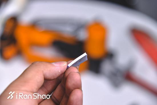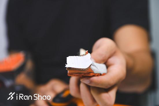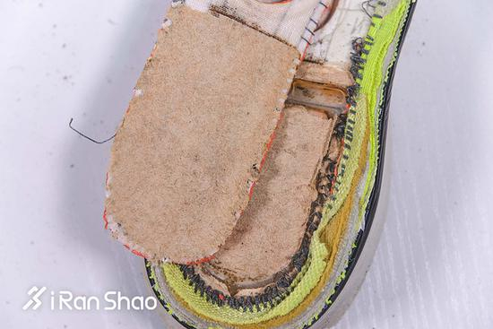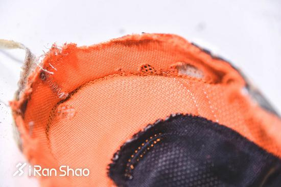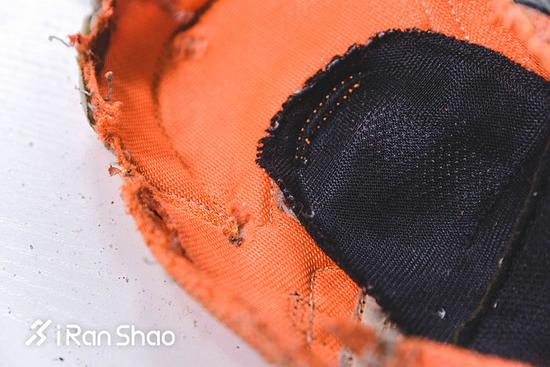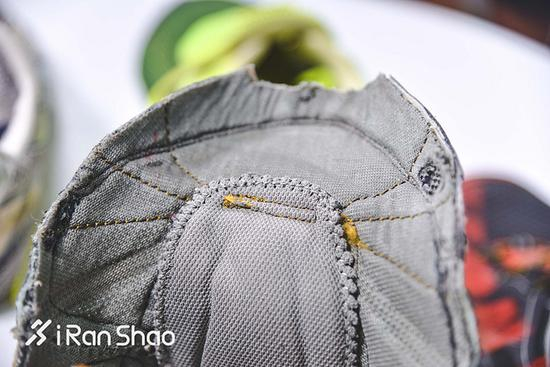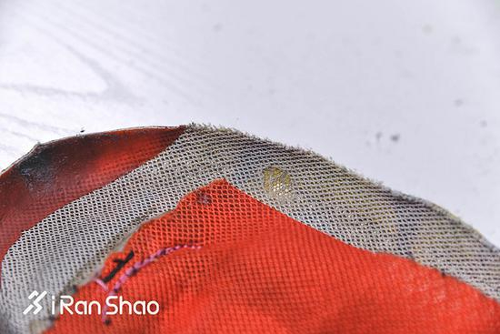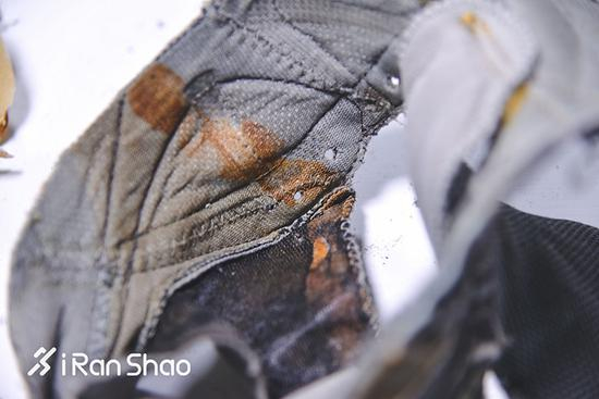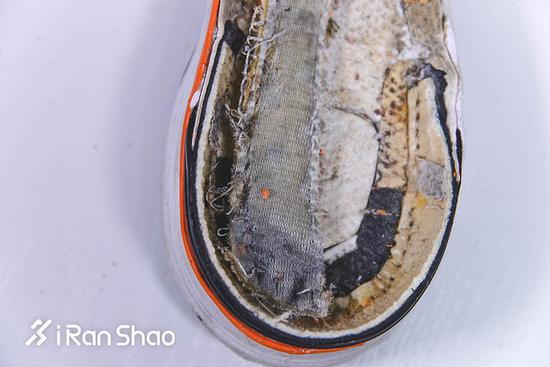 相比于前掌,后掌鞋口位置在被拆开之后像一团散沙一般散开。内部环形硬质支撑材料早已发黄,并且变得没有支撑可言。拿开鞋口的包裹泡棉之后,在鞋面上甚至看到长时间使用时候留下的锈迹。