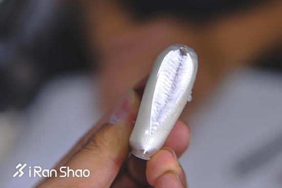 GT-2110同样内置GEL缓震胶,位于后掌位置。这块呈蓝色圆环型的GEL缓震胶显然要比我们刚刚拆解的Lyteracer TS 2实在许多。GEL缓震胶本身仍然具备一定的柔软和回弹特性,但是整块GEL表面随便用手摩擦便会出现一些白色粉末,表明这块GEL已经接近寿终正寝。