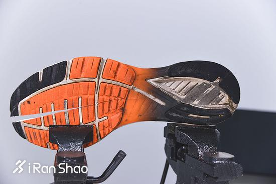 前后掌的落地区域已经被完全磨平,后掌边缘的白色橡胶已经被磨穿,红色的中底裸露在外,失去了保护。从足弓位置我们能看出原先中底的菱形齿纹有多厚,但是在前掌这些部位已经变得光滑,失去防滑性能。