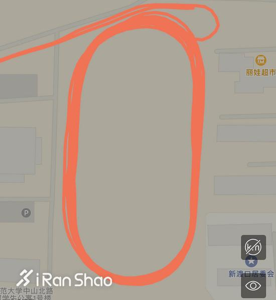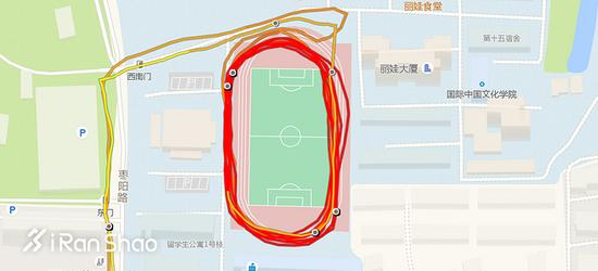 从细节来看,在较为空旷的操场路段米动青春版和Spartan Sport的GPS表现都相当不错。只不过Spartan Sport的GPS记录打点更为频繁,所以实际GPS轨迹较多弯曲,而米动青春版为了确保续航时间,则降低了GPS打点的频率,所以轨迹图看起来更为光滑。
