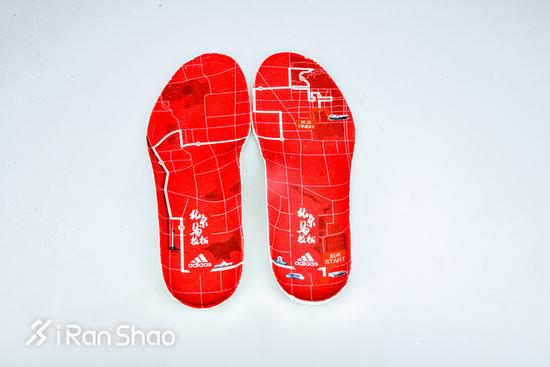 隐藏在鞋子里面的更多北马元素:两只鞋垫拼成了北京马拉松的路线图,可真是将北马之路踩在脚下了。