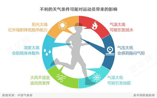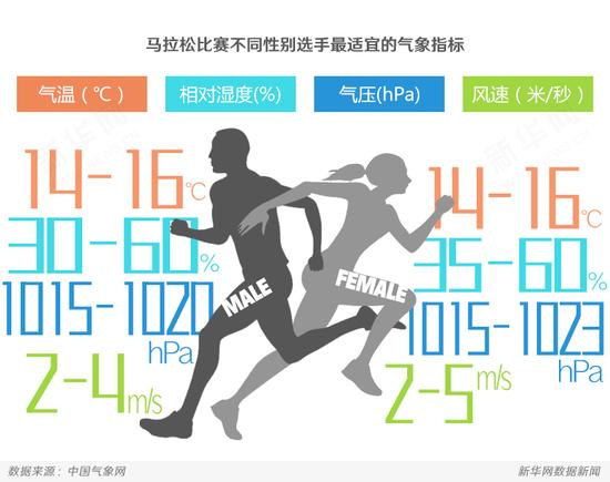 根据相关的统计分析发现,在北京马拉松比赛中,气象因素的综合影响,可造成比赛成绩最大变化幅度约9至12分钟。此外,不同性别运动员比赛成绩对气象要素反应的敏感程度也不同——男运动员对气温反应最为敏感,女运动员则对风速反应最敏感。