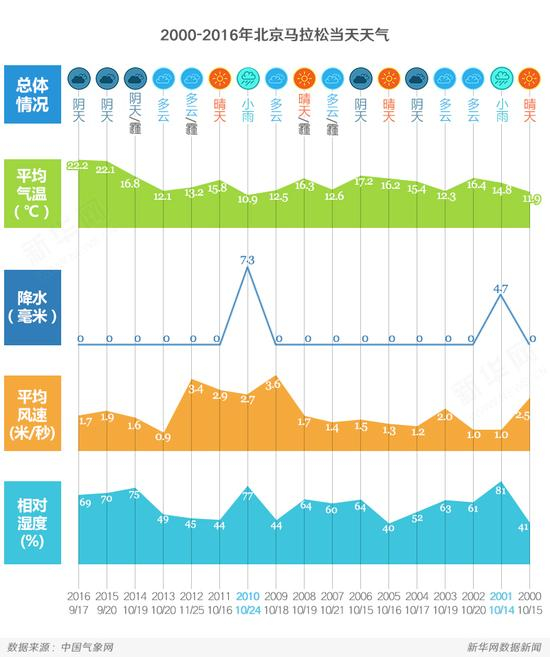 那么,历次北马比赛时的天气状况究竟如何呢?相关统计数据显示,自2000年以来,仅有两次比赛时遇到下雨(小雨)天气,且比赛当天的温度也都较为适宜,也算是“天公作美”了。