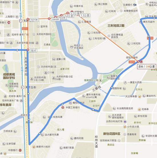 新鸿南路至天府大道天晖中路口行驶路线及站点不变,右转经府城大道中段,左转至益州大道北段,左转至锦城大道,右转至天府大道北段辅道后回原线行驶。
