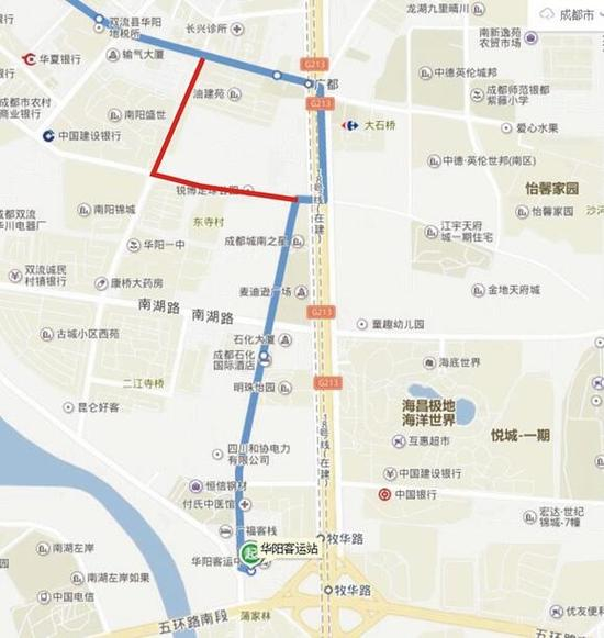 华阳客运站出发经天研路、(左转)南湖路、(右转)二江路、(左转)正东街、(右转)广都上街(左转)至华阳大道广都上街口后回原线路行驶,返程不变。