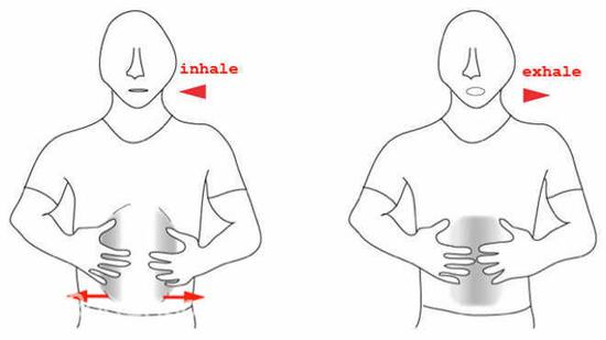 2、先轻轻地吸一点气,将双手分别放在胸前和腹部,接着缓慢而深沉地、逐渐收起肚子、一边由嘴巴吐气,你会感觉到横膈膜自然地放松上升,将腹部与胸腔的空气排出。如果你做得不错,放在腹部的一手将会随腹部内凹,而胸前的一手仅会微微压入、甚至没有任何变化。