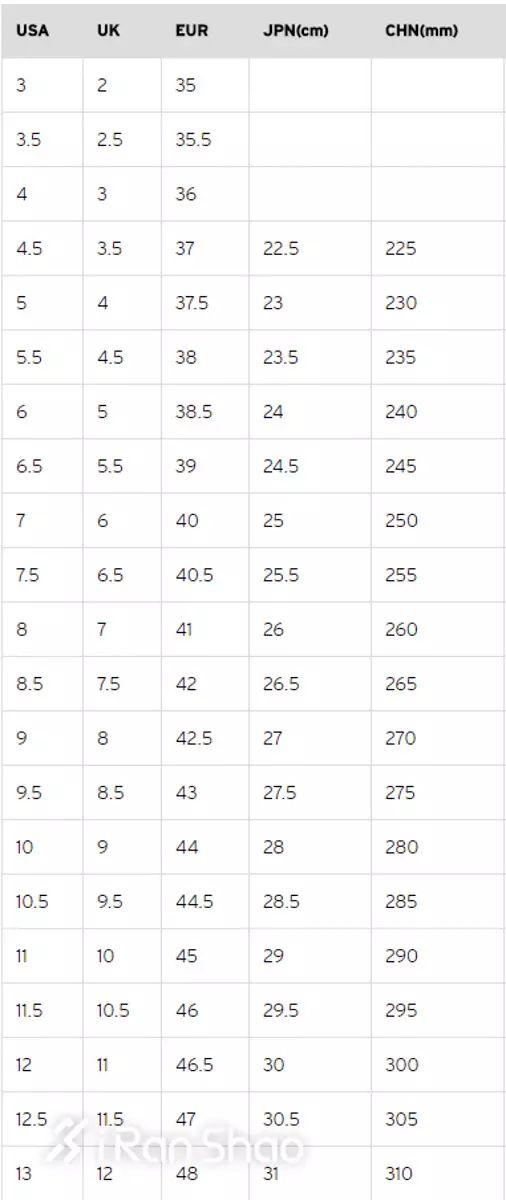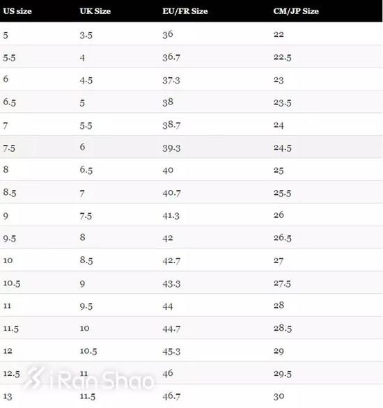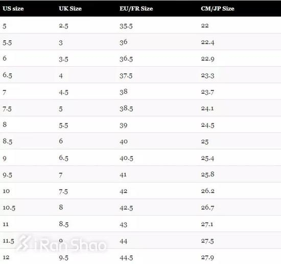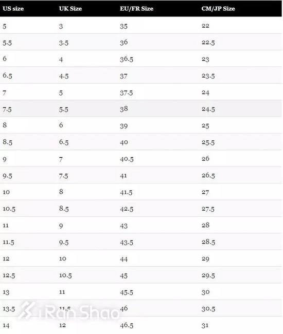 鞋子的尺码,又叫鞋号,一般有四个标准的尺寸——US(美码)、UK(英码)、EU(欧码)和CM(国际标准鞋号)。