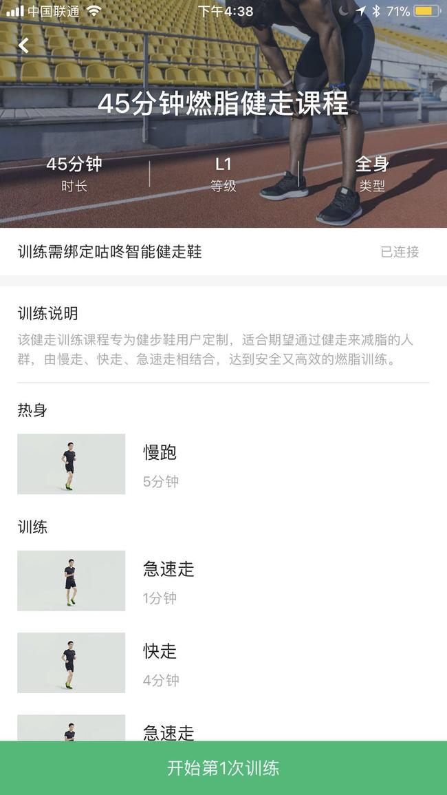 另外,在咕咚APP的训练计划内,还专门为智能健步鞋开设了一个45分钟燃脂健走课程,训练的时间需要绑定这款智能健走鞋,也算是买鞋后获赠的免费课程了。